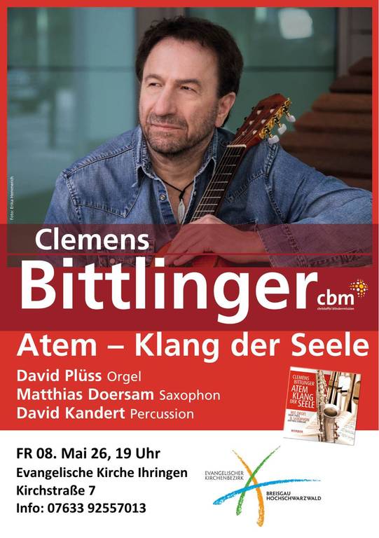 Über 100 Konzerte gestalten der Liedermacher & Pfarrer Clemens Bittlinger und seine Musiker in jedem Jahr bundesweit. Dabei treten sie meist in Kirchen auf. Höchste Zeit also, dass nun „die Königin der Instrumente“, die Orgel endlich auch einmal mit einbezogen wird. Den Schweizer Tastenvirtuosen David Plüss kennen viele als versierten Keyboarder und ausgefeilten Arrangeur, was die meisten jedoch nicht wissen ist die Tatsache, dass er Zuhause in seiner Gemeinde regelmäßig die Orgel betätigt. Dieser verborgene Schatz wird nun gehoben. Dabei wird er musikalisch wunderbar unterstützt und inspiriert durch den exzellenten Saxophonisten Matthias Doersam, einem bundesweit gefragten Live – und Studioinstrumentalisten und durch den Percussionisten und Sänger David Kandert. Der Titel des Konzertes „Atem-Klang der Seele“ beschreibt die Gemeinsamkeit von Orgel, Saxophon und Stimme – sie erzeugen durch Luft, durch den Atem einen Klang und hauchen so dem jeweiligen „Instrument“ seine Seele ein. Dass Clemens Bittlinger dabei unterstützend noch zur Gitarre greift, lässt dieses Konzert zu einem sapannenden Dialog zwischen Liedermacher und moderner Kirchenmusik werden. Über 500 Lieder hat der Sänger z.T. gemeinsam mit David Plüss in den vergangenen Jahrzehnten geschrieben. Längst haben viele dieser Werke, in zum Teil millionenfacher Auflage, Eingang in das allgemeine Gemeindeliedgut gefunden. Gepaart mit ganz neuen, eigens für dieses Konzept komponierten Liedern, werden nun einige seiner beliebtesten Texte und Melodien in dieser besonderen Besetzung ganz neu zu Gehör gebracht. Dass dabei der Humor und auch das gemeinsame Singen mit dem Publikum nicht zu kurz kommen, dafür steht schon der Name Clemens Bittlinger.