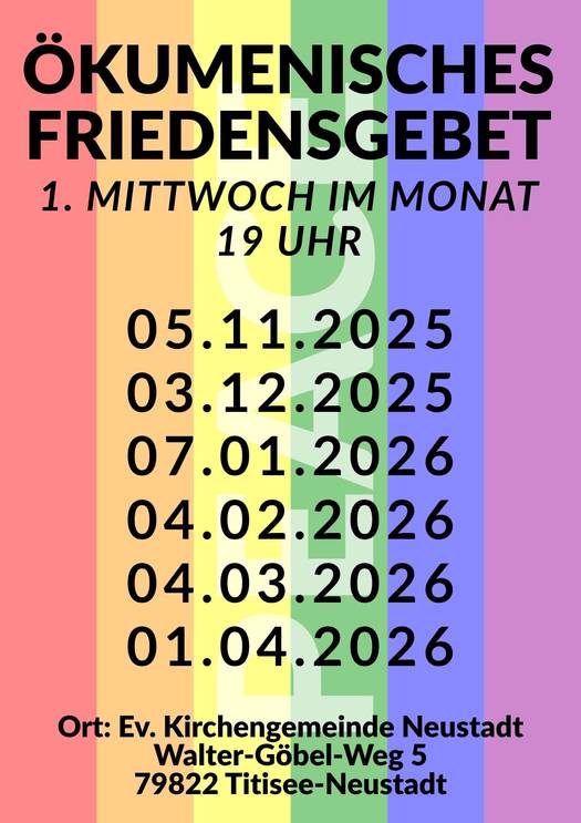 Das Friedensgebet findet derzeit an jedem ersten Mittwoch im Monat bei uns im evangelischen Gemeindezentrum in Neustadt statt.